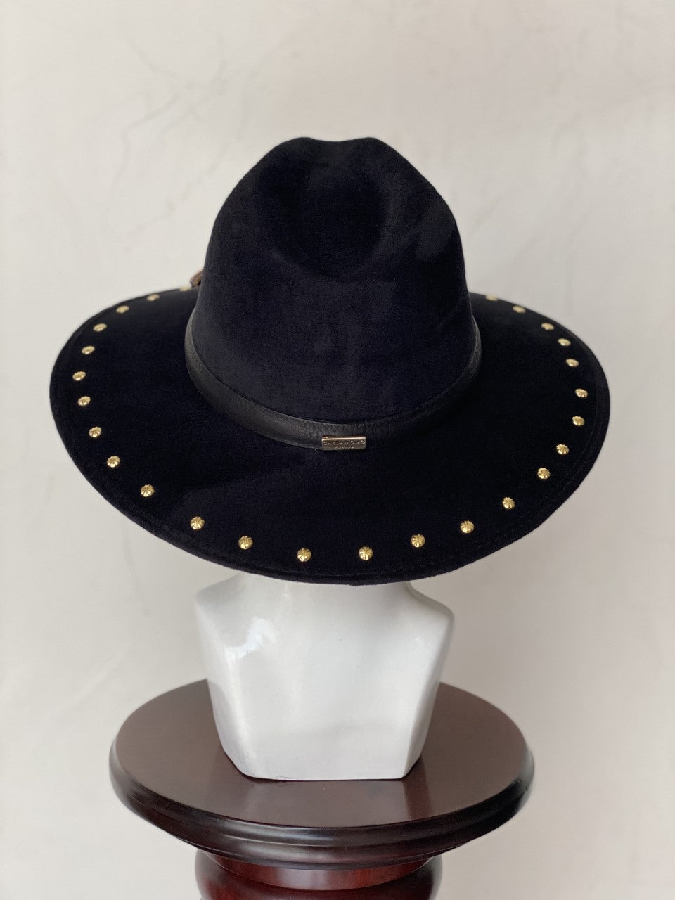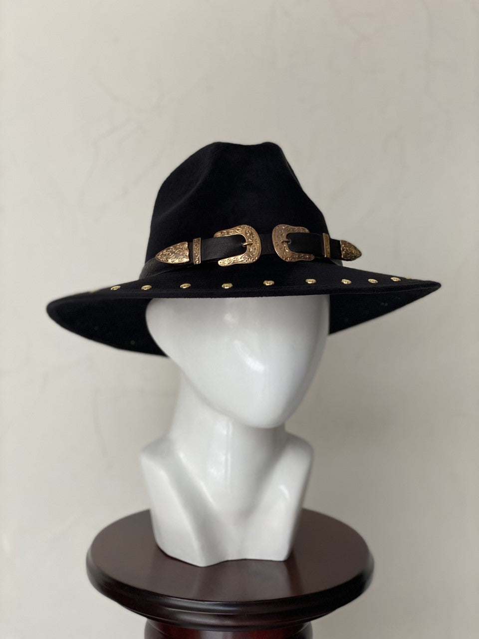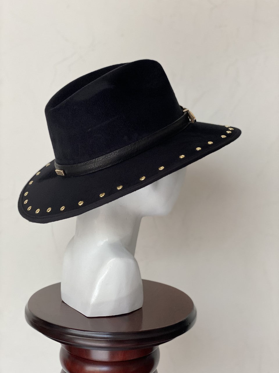 Detalles: Toquilla en piel con herrajes dorados y aplicaciones alrededor