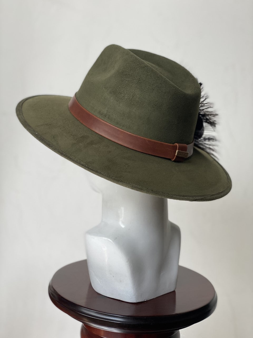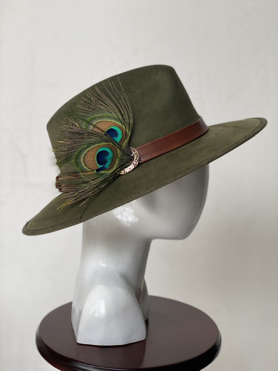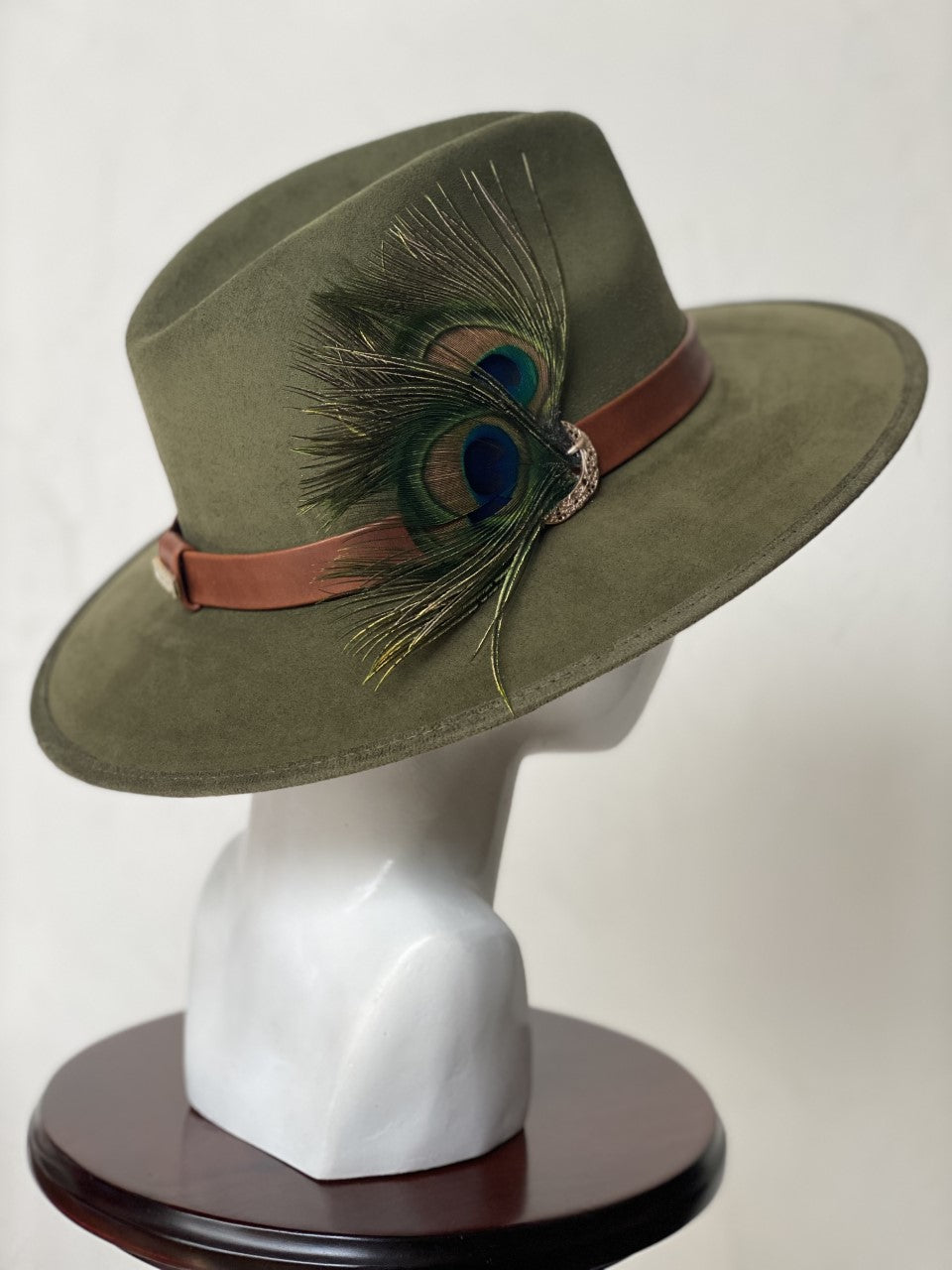 Detalles: Toquilla 100% piel vacuna con aro acabado oro amarillo y plumas de pavoreal